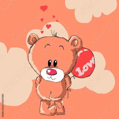 friendship, bear, love, adorable, lovely, greeting, pet, fun, red, brown, balloon, holiday, teddy, card, 1, cute, ink, small, illustration, icon, painted, colours, doll, colourful, toy, postcard, vignetting, romantic, hand, cartoon, happy