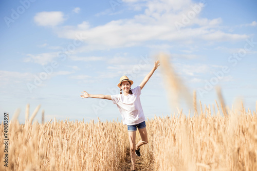 Teenage girl in hat running on field on summer day.