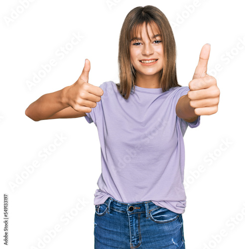 Teenager caucasian girl wearing casual clothes approving doing positive gesture with hand, thumbs up smiling and happy for success. winner gesture.