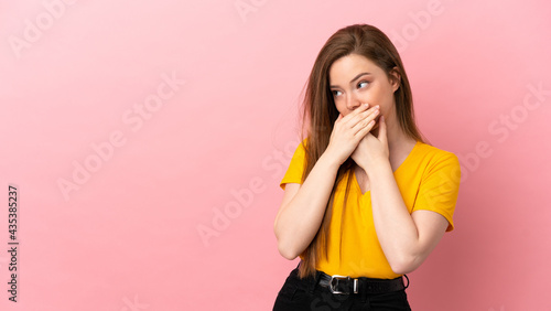 Teenager girl over isolated pink background covering mouth and looking to the side