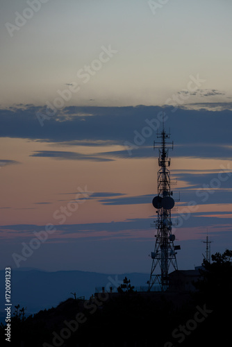 antennae, broadcasting, cloud, colourful, communication, dawn, dusk, evening, hill, horizon, landscape, mountain, nature, network, outdoors, radio tower, scenery, scenic, signal, silhouette, sky, sunset, technology, telecom, tower, transmission, twilight, wireless, spain