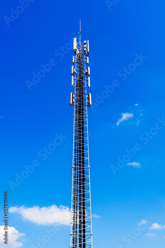 Telecommunication tower with 5G cellular network antenna. Cell Phone Signal tower on sky background.