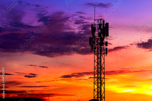Telecommunication towers with colorful sky as a backdrop in the morning and sunlight reflecting off clouds create a stunning and mesmerizing light effect. Concept of innovation, technology and environ