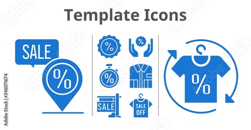 template icons set. included sale, shirt, discount, placeholder, stopwatch icons. filled styles.