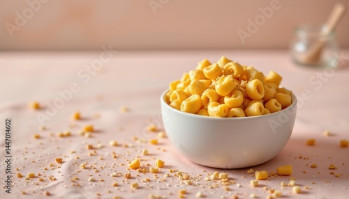 Tempting mac and cheese in the soft corner on a coconut cream background, in a clean food photography style, with silky ambient radiance, spacious layout, high resolution