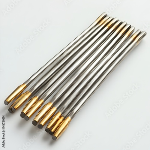 Ten sleek metallic rods with gold-tipped ends lie neatly arranged on a pristine white background ready for industrial use.