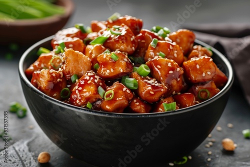 Teriyaki chicken topped with sesame seeds and green onions in an elegant black bowl - culinary presentation - recipe inspiration - gourmet dining