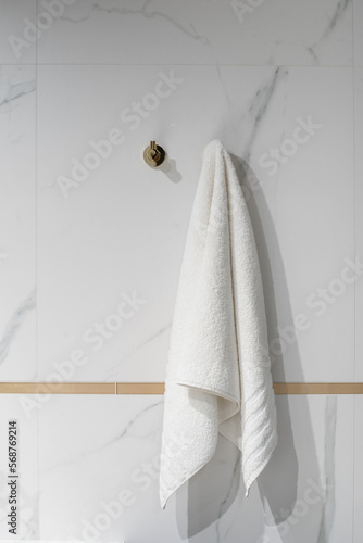 hook, hanger, towel, wall, marble, bathroom, hanging, metal, design, interior, tile, background, gold, modern, closeup, terry, object, clean, bathe, detail, room, indoor, hotel, home, accessory, fresh, clothing, luxury, minimalism, style, iron, cotton, white, stainless, fabric, textile, steel, house, coat, clothes, washroom, empty, garment, concept, lavatory, vertical, nobody, dry, soft
