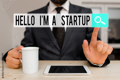 Text sign showing Hello I M A Startup. Business photo showcasing Entrepreneur starting business Presenting New project Male human wear formal clothes present presentation use hi tech smartphone