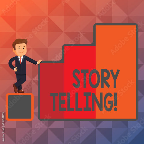 Text sign showing Story Telling. Business photo showcasing activity writing stories for publishing them to public Happy Businessman Presenting Growth and Success in Rising Bar Graph Columns