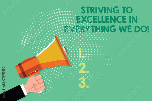 Text sign showing Striving To Excellence In Everything We Do. Conceptual photo Searching perfection high quality Male Hu analysis Hand Holding Gripping a Megaphone on Dotted Halftone Pattern