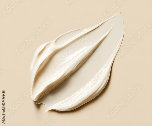 Texture of white cream on beige background. Smear of moisturizer closeup. Lotion swatch.
