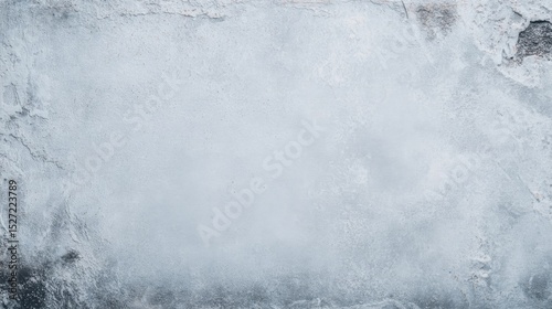 Textured grayscale wall surface with rough, cracked, and uneven patches, showcasing varying shades of white, gray, and subtle blue tones, creating a cold and muted minimalist aesthetic. Upper right co