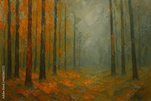 Textured painting of misty autumn forest, warm orange leaves contrast with cool fog tones, serene atmospheric landscape.
