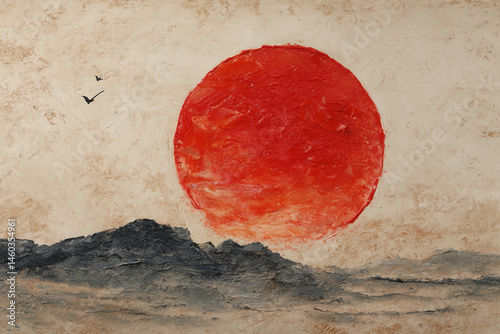 Textured painting of red sun setting behind gray mountains Beige background Two birds flying Symbolic of peace, tranquility, nature