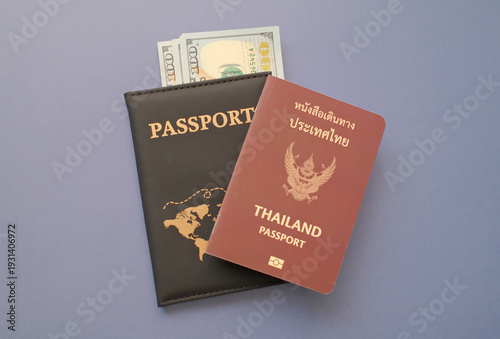 Thailand passport with US dollar banknotes in leather cover on gray background, travel and immigration finance concept