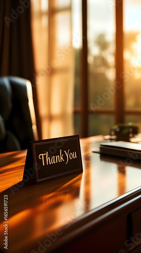 gratitude, business, corporate, professional, workplace, window light, appreciation, elegant, formal, nameplate, golden hour, atmospheric, moody, corporate culture, workspace, office furniture, natural light, management, leadership, success, achievement, career