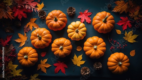 Thanksgiving backdrop decoration featuring dried leaves, red berries, and pumpkins. Flat lay, overhead view with space for text for the concept.