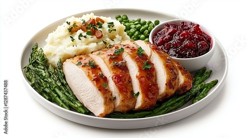 Thanksgiving feast plate with turkey slices, mashed potatoes, gravy, and cranberry sauce, hyper-detailed, food photography look, isolated on white background