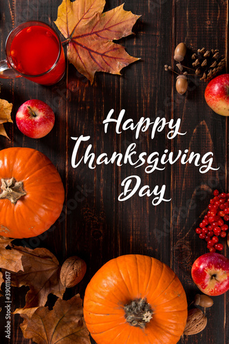 Thanksgiving greetings. Dry yellow leaves, pumpkins, berries, nuts and frame on a wooden background, top view. Kaligraphic capital inscription.