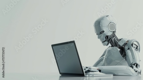 The AI robot sits at a desk, typing on a laptop. The robot appears to work in the manner of an office employee. Interaction between humans and artificial intelligence technologies.