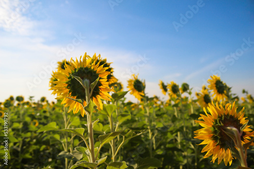 yellow, sunflower, field, floral, flower, blossom, behind, agriculture, back, background, beautiful, beauty, blooming, blue, colourful, farm, flora, garden, green, growth, landscape, leaf, natural, nature, outside, plant, plantation, rural, scene, season, sky, summer, sun, sunflower, sunny