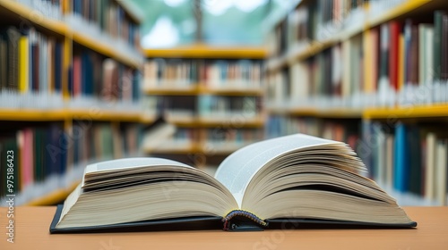 The background of a bright public library room features blurry bookshelves, a stack of books, and an open book on the desk.