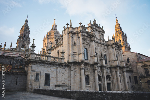 The baroque facade of the cathedral of santiago de compostela, bathed in the golden light of the setting sun