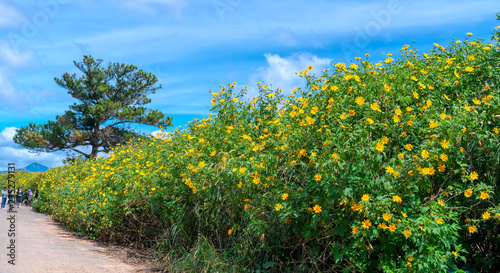 The beautiful road with wild sunflowe on both sides of the blooming golden road as welcoming attracts people to want to go through this idyllic plateau.