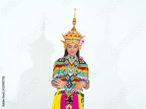 The beautiful woman wearing Thai Tradition southern costume and put headdress on her head,standing on white background,folk dance,black shadow reflection on white background