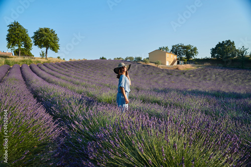 The beautiful young girl in a blue dress walks across the field of a lavender, long curly hair, smile, pleasure, mountains on background, a house of the gardener, trees, perspective of a lavender