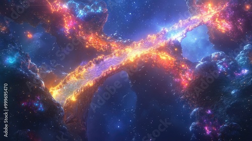 The Bifrost Bridge from an aerial perspective, connecting the realms with radiant colors, as stars and galaxies shine brightly in the distance.