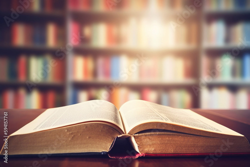The Book Day concept of education and learning is shown with a book being opened in an old library and a classroom full of book shelves in the blurred background. Generative AI