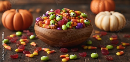halloween, candy, bowl, pumpkin, autumn, fall, gummy, gummy, eyeball, sweet, treat, colourful, festive, seasonal, harvest, rustic, wooden, table, closeup, still life, party, snack, sugar, confection, decor, orange, green, purple, red, texture, centrepiece, holiday, celebration, background, tabletop, delicious, light