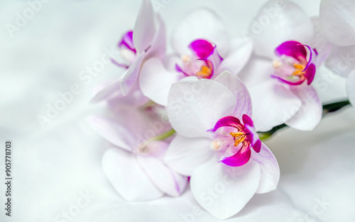 The branch of white orchids on white fabric background