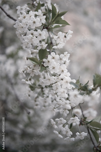The branches of a blossoming tree. Cherry tree in white flowers. Blurring background. Beautiful blooming white cherry, branch