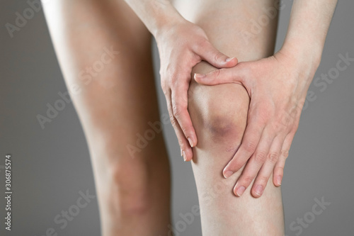 The bruise on his knee. Knee pain. The woman holds her leg. Close up