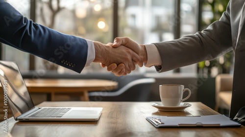 business, handshake, meeting, partnership, agreements, office, teamwork, negotiation, collaboration, success, professional, hot drink, laptop, desk, documentation, corporate, client, trust, communication, connection, strategy, productivity, modern, workspace, human relationships, discussion, leadership, alliance, finance, support, contract