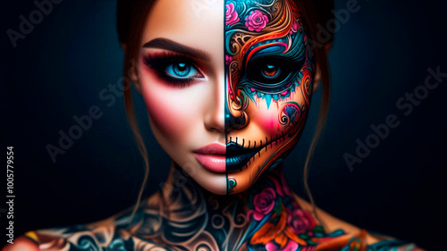 The charming woman's face is split, with one side adorned with intricate body art in a vibrant color palette and the other hidden behind a surreal mask featuring a creepy doll head symbolizing duality