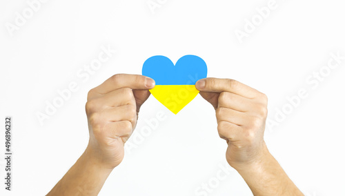 The concept of ending the war in Ukraine. heart in the colors of the flag of Ukraine in men's hands