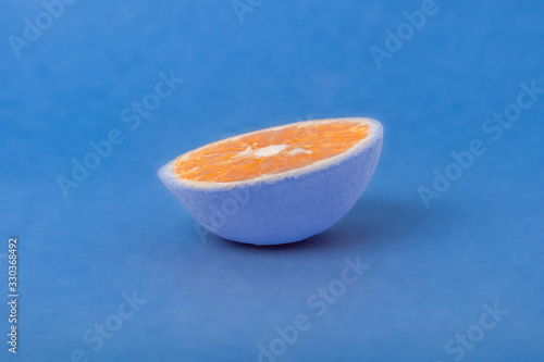 The concept of non-standard thinking and creativity. On a blue background, a blue tangerine is cut in half. The inside of a Mandarin orange.
