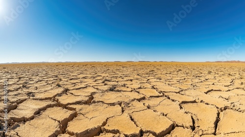 The cracked and dry surface of a desert floor, stretching out under a cloudless sky.