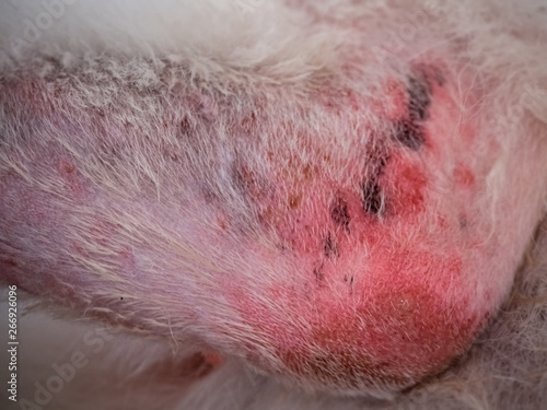 The Dermatitis disease on dog leg,itchy and sculpt,skin problem in dog,hypersensitivity,unhealthy.blurry light around