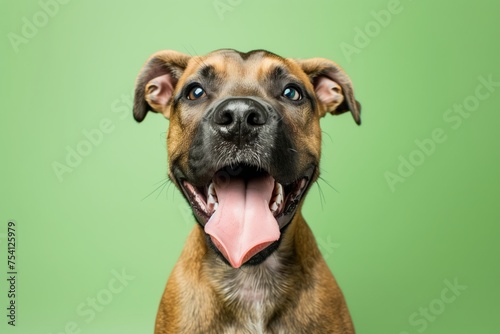 the dog licks his lips against a light green background. hungry dog