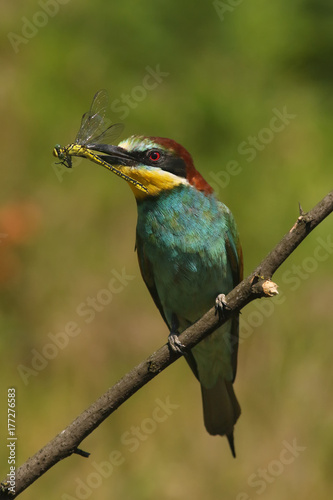 The European bee-eater (Merops apiaster) is sitting on thin branch with typical food dragonfly in the beak with green and yellow background