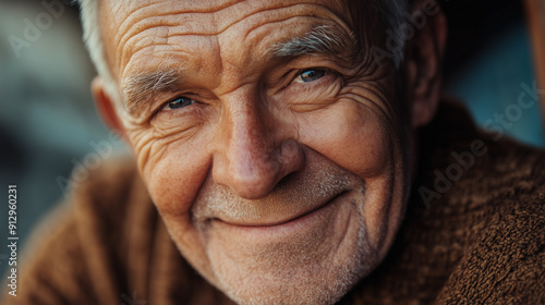 The face of a smiling older man shows his friendly and radiant face. His wrinkles, which add character, and his warm smile, express kindness and cheerfulness.