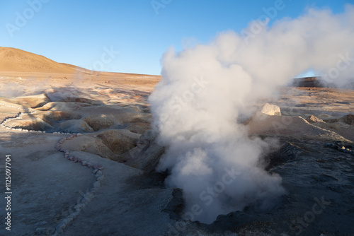The famous geyser Sol de Mañana in geothermal area near Salar de Uyuni, the world's largest salt flat.