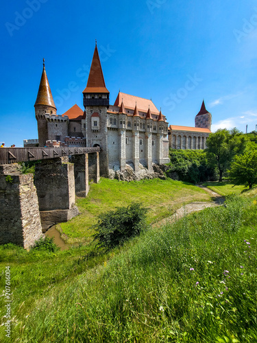 The famous Hunedoara Castle, Castelul Corvinilor or Corvin Castle with the Podul de Lemn castle bridge in summer with a blue sky, Hunedoara, Transylvania, Romania