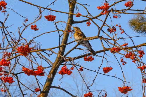 The Fieldfare thrush sitting on a Rowan tree in a frosty day