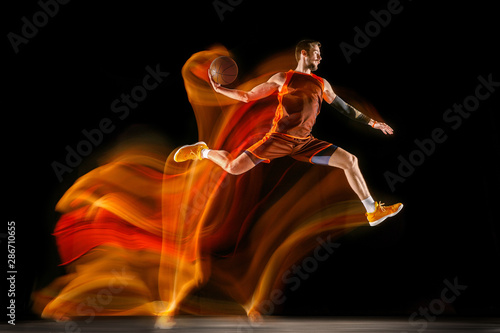 The fire tracks. Young caucasian basketball player of red team in action and jump in mixed light over dark studio background. Concept of sport, movement, energy and dynamic, healthy lifestyle.